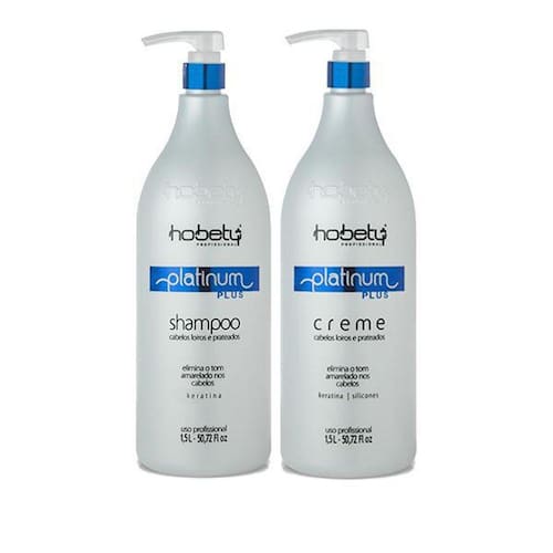Kit Hobety Platinum Plus Shampoo 1,5Lt + Creme 1,5LtPigmentador específico para cabelos louros/grisalhos. Elimina o tom amarelado causado pelo desbotamento da cor, ação do sol e processos químicos, reavivando a cor. Os nutrientes da queratina restauram o brilho e a sedosidade.O Shampoo Platinum Hobety Professional foi desenvolvido para Cabelos Loiros e Prateados. Indicado para cabelos com luzes e reflexos, deixando-os naturalmente enriquecidos pelos Nutrientes da Queratina. Elimina o tom amarelado causado pelo sol e produtos químicos.Conselho de Aplicação:Aplicar uma pequena quantidade nos cabelos úmidos, massageie de 3 a 5 minutos, repita a operação se necessário.O Kit contém:01 Shampoo Platinum Plus 1,5LT01 Creme Platinum Plus 1,5LT