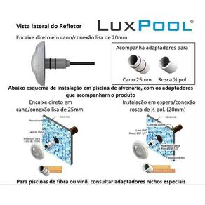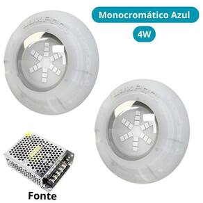Kit de iluminação azul para piscina de até 16m- os refletores de 4w iluminam até 8m cada- refletor mais compacto do mercado, 7,5cm de diâmetro- este kit ilumina piscinas de até 16mConteúdo do kit:1 fonte chaveada 5a 60w 12v2 refletores luxpool 4w 12v azul com cabo de 2m2 dispositivos para encaixe em cano de 25mm2 dispositivos para encaixe em cano de rosca bsp cônicaDiâmetro: 7,5cmProfundidade: 5,9cmProfundidade corpo embutido: 3,6cmPeso: 0,300gr Imagens meramente ilustrativasCarrapeta, aqui tem qualidade Marca: Luxpool