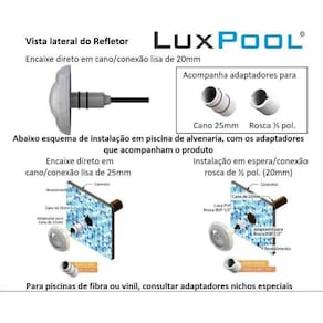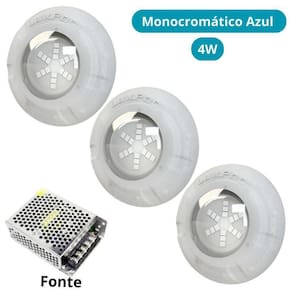 Kit de iluminação azul para piscina de até 24m- os refletores de 4w iluminam até 8m cada- refletor mais compacto do mercado, 7,5cm de diâmetro- este kit ilumina piscinas de até 24mConteúdo do kit:1 fonte chaveada 5a 60w 12v3 refletores luxpool 4w 12v azul com cabo de 2m3 dispositivos para encaixe em cano de 25mm3 dispositivos para encaixe em cano de rosca bsp cônicaDiâmetro: 7,5cmProfundidade: 5,9cmProfundidade corpo embutido: 3,6cmPeso: 0,300gr Imagens meramente ilustrativasCarrapeta, aqui tem qualidade Marca: Luxpool