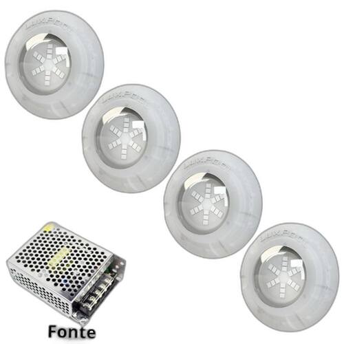 Kit de iluminação azul para piscina de até 32m - os refletores de 4w iluminam até 8m cada - refletor mais compacto do mercado, 7,5cm de diâmetro - este kit ilumina piscinas de até 32m Conteúdo do kit: 1 fonte chaveada 5a 60w 12v 4 refletores luxpool 4w 12v azul com cabo de 2m 4 dispositivos para encaixe em cano de 25mm 4 dispositivos para encaixe em cano de rosca bsp cônica Diâmetro: 7,5cm Profundidade: 5,9cm Profundidade corpo embutido: 3,6cm Peso: 0,300gr Imagens meramente ilustrativas Carrapeta, aqui tem qualidade Marca: Luxpool Ean: 7897532545177