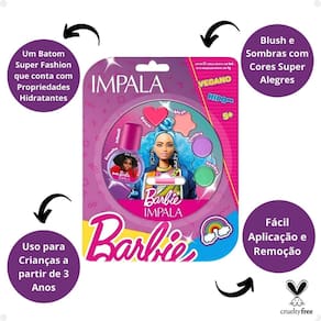 O Kit Impala Barbie Esmalte e Kit de Maquiagem Infantil e Pincel Aplicador foi desenvolvido especialmente para crianças a partir de 3 anos. Cor, atitude e alegria se juntam nessa linda coleção Impala Barbie! São esmaltes e maquiagens com tonalidades lindas e vibrantes para destacar a força e a capacidade das pequenas de serem o que quiserem! A linha foi desenvolvida com a formulação hipoalergênica, dermatologicamente testada, vegana e não testada em animais, à base de água para fácil remoção.