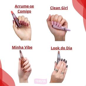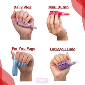 Kit contém 8 esmalte: 1 Arrume-se Comigo, 1 Meu Dump, 1 Daily Vlog, 1 Clean Girl, 1 Look Do Dia, Minha Vibe, 1 For You Page e 1 Entregou Tudo