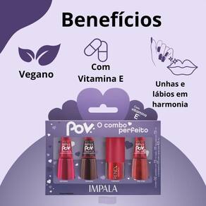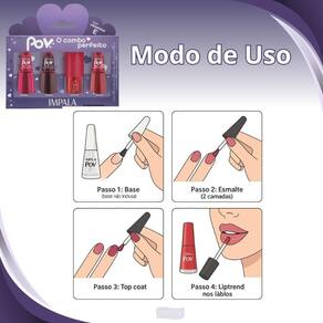 Produto: Kit Impala Pov 2.2 Antonela: 2 Esmaltes, 1 Top Coat e 1 Gloss Labial