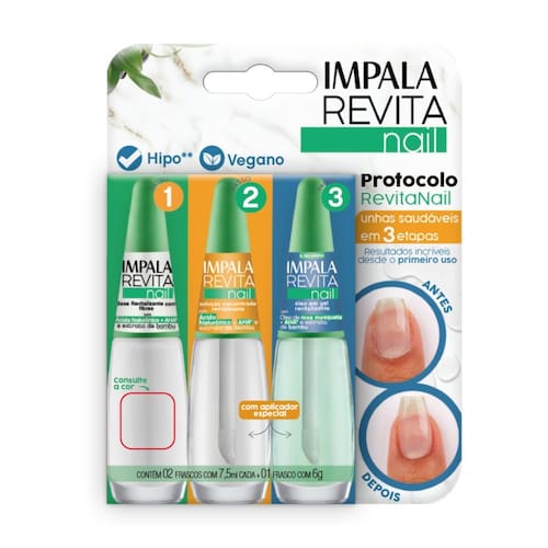 Kit Impala Revita Nail Unhas Saudáveis Transforme o cuidado das suas unhas com o Protocolo Impala RevitaNail ! Desenvolvido em 3 etapas práticas, este kit completo oferece uma base revitalizante com f