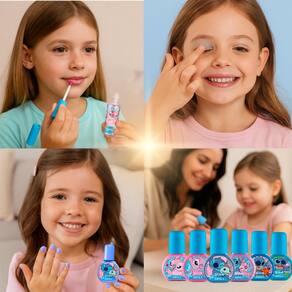 O brilho labial e a paleta possuem textura leve e segura para crianças, com ingredientes suaves e de fácil remoção.