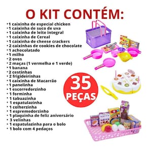 Kit com 35 peças Comidinhas, Cesta Cozinha Completa, Cesta de Compras Mini Mercado Infantil e Bolo de AniversárioAs crianças estão sempre em busca de brincadeiras e diversão, não importa onde e nem quando, o que elas sempre querem é brincar.A hora de brincar vai ficar ainda mais legal com esse Kit !Vem com utensílios de cozinha, caixinhas de comida, frutinhas, legumes e um bolinho para a diversão ficar mais incrível. Com esse kit, é impossível não levar a brincadeira para qualquer lugar!É educativo e divertido, através de uma brincadeira saudável que ensina os pequeninos, preparando a criançada para a vida do dia a dia. Esse é um brinquedo lúdico que trabalha a imaginação e a criatividade dos seus filhos, para brincarem sozinhos ou se divertirem com a turminha.Especificações:Idade: +3 anosMaterial: Plástico, Papelão e PolietilenoO Kit contém:- 1 caixinha de suco de uva - 1 caixinha de leite integral, - 1 caixinha de sucrilhos, - 1 caixinha de cheese crackers, - 1 caixinha de cookies de chocolate, - 1 achocolatado- 1 milho- 2 ovos- 2 maças (1 vermelha e 1 verde)- 1 banana- 2 cestinhas- 13 peças incluindo utensílios de cozinha e caixinhas de comida- 1 espatula para o bolo- 1 plaquinha de feliz aniversário- 3 velinhas- 1 bolo com quatro fatias
