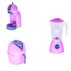 o kit vem com geladeira, microondas e fogão cooktop com panelas, air fryer, cafeteira com cápsula, batedeira, forminhas com acessório , liquidificador, potinhos para mantimentos, panelinha de pressão, xícaras e bulê, frutinhas que se dividem, comidinhas, louças