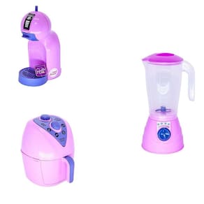 o kit vem com geladeira, microondas e fogão cooktop com panelas, air fryer, cafeteira com cápsula, batedeira, forminhas com acessório , liquidificador, potinhos para mantimentos, panelinha de pressão, xícaras e bulê, frutinhas que se dividem, comidinhas, louças