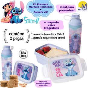 Conjunto para lanches de plástico. Conta com decoração de um dos personagens mais queridos das crianças, o Stitch. Este conjunto é composto por 1 garrafa com tampa de rosca com capacidade para 660ml e 1 pote hermético de 850ml com travas laterais e vedação de borracha. O pote conta ainda com divisória removível para melhor acomodação do alimento. O kit acompanha caixa e é ideal para presentear quem você gosta. A decoração é estampada com tecnologia intra-imagem, que garante vida longa às suas cores e desenhos. Os produtos são produzidos em material atóxico e livre de BPA em sua composição (BPA-Free), o que permite serem levados ao freezer ou ao micro-ondas com segurança total.