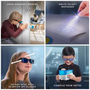 Conteúdo da embalagem: Rodas decodificadoras, periscópio, óculos retrovisor, caneta tinta invisível, caderno, adesivos, crachá, manual