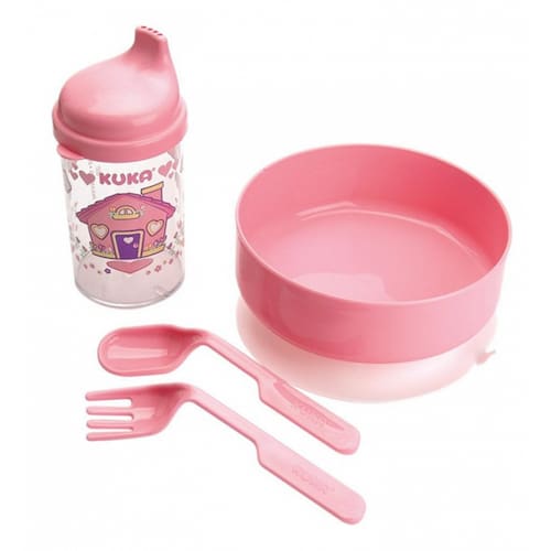 Prato com ventosa de borracha para fixar na mesa Contém 1 colher, 1 garfo ergonômicos e 1 copo decorado com capacidade de 200 ml Inodoro, antialérgico e atóxico Livre de bpa