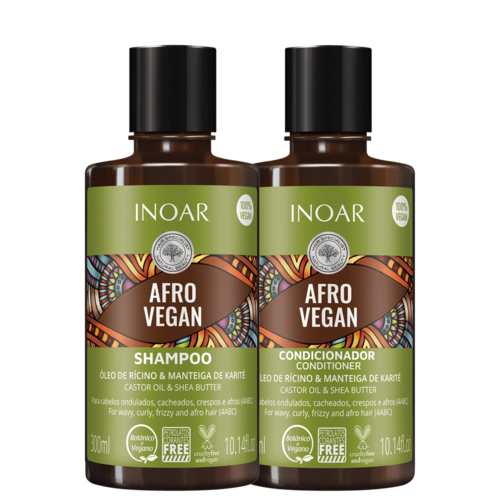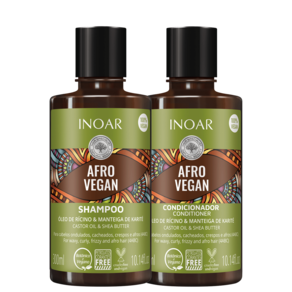 Kit para cabelos ondulados, cacheados, crespos e afros. Kit Inoar Afro Vegan Duo traz um cuidado diário nutritivo e hidratante, perfeito para cachos 4ABC.