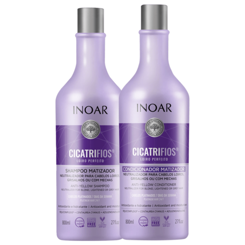 O Kit Inoar Cicatrifios Loiro Perfeito Salon traz uma fórmula com ativos especiais para deixar os fios saudáveis e com a cor impecável, agindo na correção do amarelado dos fios desde o primeiro uso. É ideal para proporcionar um cabelo macio, brilhante e com a nuance mais fria.