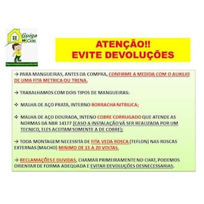 Kit instalação gás encanado mangueira 80cm+registro+adaptado Kit instalaçao gás encanado mangueira 80cm+registro+adaptado Obs: este kit é compatível com qualquer marca e modelo. Obs: temos outras medidas das mangueiras: 80cm, 1,00mt, 1,20mt, 1,50mt, 2,00mt, 2,50mt, 3,00mt: use o campo de perguntas para cotação de valores... Kit contém: 1- flexível rosca 1/2 tamanho 80cm material borracha nitríca com cobertura trançada metálica conforme norma nbr 14.955 e 13419, pressão de trabalho: 2,0 mpa / 20 bar / 290 psi, pressão de ruptura: 10,0 mpa / 100 bar / 1450 psi, temperatura de trabalho: -20c à 120c 1- registro 1/2 angular 90 macho/macho abre fecha o gás 1- adaptador dako latão femea para flexivel em bico mamadeira dos aparelhos 1- fita teflon veda rosca 18 x 50mm 1- anel vedação borracha nitrílica para água e gás Obs: instruções de utilização do flexivel de borracha para condução de gases glp/gn conforme a norma nbr 13.419 enbr 14.955 1) os tubos flexiveis só devem ser instalados em aparelhos de queima, com reguadores de pressão, fabricados conforme a norma nbr. 8473; 2) os tubos flexiveis só devem ser instalados em aparelhos que, quando pleno uso, não provoquem no ponto de ligação, ou no ambiente por onde passam,A temperatura superior a 120c e inferior a -20c 3) os tubos flexiveis não devem atravessar nem ser embutidos em paredes e pisos; 4) não é permitido efetuar qualquer tipo de inserção ou emenda (soldagem ou colagem); 5) nos pontos de ligações fixar as extremidades somente com conectores e vedações apropriados; 6) o tubo flexivel não deve atravessar por trás de aparelhos de queima; 7) não e permitido o uso de mais de um tubo flexivel ligados em série; 8) o tubo flexivel não deve ser instalado torcido; 9) obedecer ao raio minimo de curvatura adimissivel de 102mm; 10) não apertar excessivamente os terminais roscaveis ( aperto excessivos podem espanar os terminais); 11) verificar se há vazamentos antes de ultilizar o fogão, o teste deve ser feito com espuma(àgua e sabão),se houver bolhas é sinal de vazamento. Refaça a instalaçâo; 12) não nos resposabilizamos por má instalação do produto; 13) consulte sempre um tecnico de instalação de gás. Composição do produto: Nbr 13.419- mangueira de borracha nitrilica, capa trançada com fios de aluminio e luva de aperto metalica. Nbr 14.955- mangueira de borracha nitrilica, capa trançada com fios de aluminio, conexões de latão e luva de aperto metalico. Possui certificado de qualidade Obs: guiga gás peças e acessórios fornece toda linha para instalação a gás glp e gn veja todos nossos produtos em mais anuncios do vendedor.
