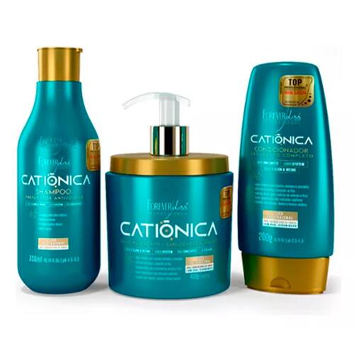 Kit Ionizante Catiônica Completa Forever Liss é um ritual de cuidado para cabelos indisciplinados, rebeldes e com volume excessivo. O Shampoo Catiônica Forever Liss de 300ml é disciplinante para cabelos rebeldes ou com frizz, proporcionando uma limpeza eficaz sem danificar os fios. A Máscara Catiônica Forever Liss de 450g restaura a estrutura das cutículas capilares, com nanopartículas com cátions ativados que eliminam a estática, corrigem a superfície capilar e promovem a atração entre os fios. É compatível com a técnica de Low Poo. O Condicionador Catiônica Forever Liss de 200g condiciona e desembaraça, hidratando profundamente os cabelos.