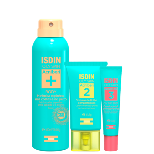 Kit com gel creme antiacne, gel secativo para espinhas e spray corporal antiacne, indicado para a pele oleosa e acneica. ISDIN Acniben Trio oferece um cuidado especial no controle da oleosidade e redução das espinhas.