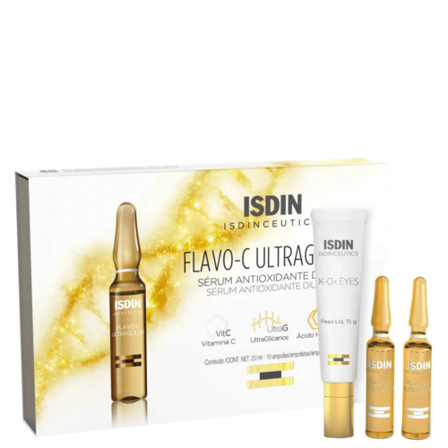 ISDIN Isdinceutics Flavo-C Ultraglican - Sérum Antioxidante Diurno 10x2ml: age como um reforço às fibras de colágeno enquanto estimula a produção do ácido hialurônico natural. Assim, seus efeitos de hidratação e rejuvenescimento são de dentro para fora da pele.