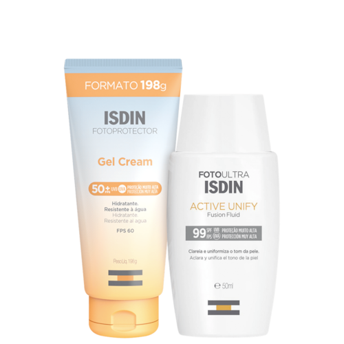 Kit com protetores solares para rosto e corpo. ISDIN Foto Ultra Active Unify + Fotoprotector Gel Cream promove proteção contra os raios UVB/UVA enquanto trata e cuida da pele.