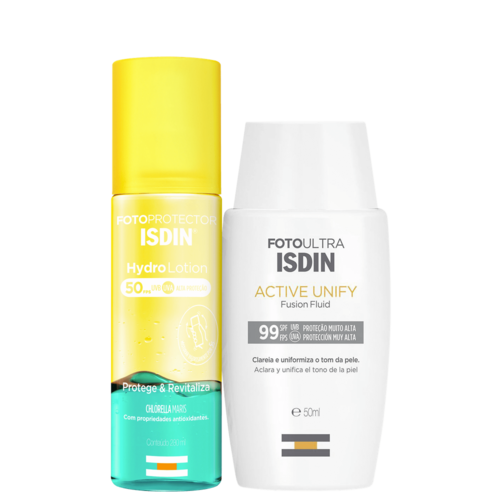 Kit com protetores solares para rosto e corpo. ISDIN Foto Ultra Active Unify + HydroLotion promove proteção contra os raios UVB/UVA enquanto trata e cuida da pele.