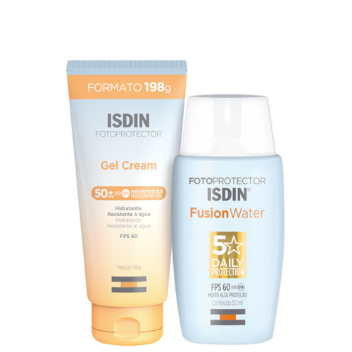 O Kit ISDIN Fotoprotector Fusion Water 5 Stars + Fotoprotector Gel Cream apresenta uma ótima dupla de proteção para pele corporal e facial. O Protetor Solar Facial ISDIN Fusion Water 5 Stars FPS 60 é ideal para peles oleosas, possui textura leve e de rápida absorção, é resistente à água e evita o ardor dos olhos. Já o Protetor Solar Fotoprotector Gel Cream FPS 50+ é indicado para todos os tipos de pele, une a hidratação do creme com a leveza e frescor do gel, é resistente à água e é não comedogênico.