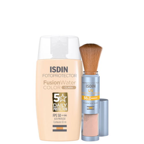 Kit com protetores solares para rosto. ISDIN Fusion Water 5 Stars Color Clara + UV Brush Mineral protege a pele e corrige imperfeições com alta cobertura.