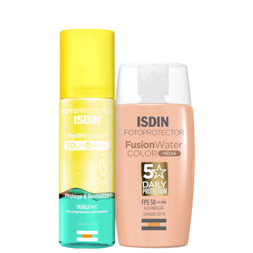 Kit com protetores solares para rosto e corpo. ISDIN Fusion Water 5 Stars Color Médio + HydroLotion protege contra os raios solares, auxilia no controle da oleosidade e revitaliza a pele.