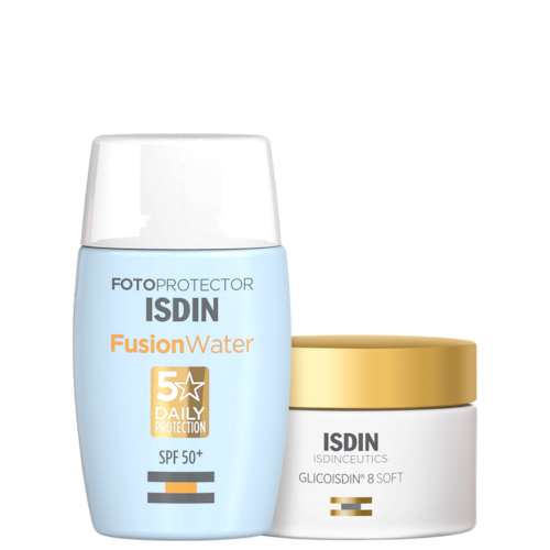 O Kit ISDIN Glicoisdin 8 Soft Fusion Water combina Ácido Glicólico e Óleo de Borragem para reduzir rugas, linhas finas e hiperpigmentações, melhorando textura, elasticidade, hidratação e luminosidade da pele, além de controlar a oleosidade facial.