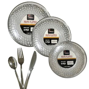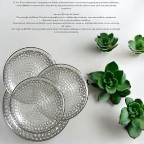 Design Elegante: A borda Prata combina beleza e requinte, tornando cada refeição uma experiência especial. Material Durável: Feitos em acrílico de alta qualidade, os pratos são resistentes, leves e perfeitos para uso interno e externo. Versatilidade: Ideal para servir saladas, entradas, pratos principais ou sobremesas em festas, celebrações e reuniões familiares. Fácil de Limpar: Podem ser lavados à mão, facilitando a limpeza após o uso.