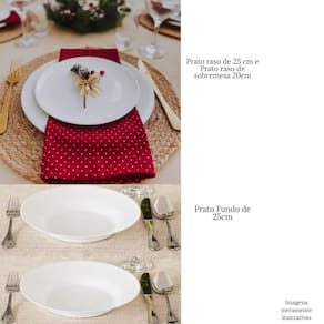 Dimensões: Peso: 100g Tamanho: 25cm com 2cm de profundidade Prato Fundo x 25cm com 0,5 de profundidades Prato Raso x 20cm com 0,5 de profundidade Prato Raso de Sobremesa