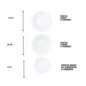 Dimensões: Peso: 100g Tamanho: 25cm com 2cm de profundidade Prato Fundo x 25cm com 0,5 de profundidades Prato Raso x 20cm com 0,5 de profundidade Prato Raso de Sobremesa