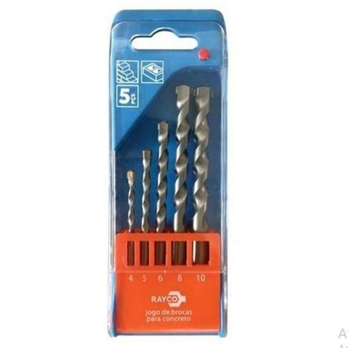 Kit Jogo 5 Brocas para Concreto 4 a 10mm Profissi Estojo Rayco Jogo de brocas para concreto 5 peças - Rayco Corpo em aço polido Ponta de Carboneto de Tungstênio (metal duro) Normas DIN 338 e DIN 8039 Conformidade com a Norma DIN Embalagem tipo estojo