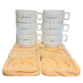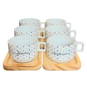Kit Jogo 6 xícaras Café Chá com pires pinus quadrado - 200ml Empilháveis - Porcelana branca decorada Peças de porcelana feitas de material de alta qualidade, queimados em alta temperatura, o que os torna fortes, resistentes e com alto brilho, e deixa qualquer ambiente mais bonito e moderno.A porcelana tem uma enorme vantagem sobre outros materiais, pois é fácil de limpar e não absorve cheiro, o que deixa a peça e o ambiente livre de mal cheiro. Podem ir ao forno, Microondas e lava-louçasCor: Decoração poá colorido com frases: Amor, Paz, Gratidão, Fé, Família e Felicidade. Capacidade das xícaras: 200mlSão empilháveis, o que torna o armazenamento mais prático. Os pires de Pinus são laváveis e podem ser lavados e higienizados normalmente junto com as xícaras. Medidas dos pires: (AxCxL): 1,6cm x 11cm x 11cmOBS: Pode haver variação de tonalidade entre as peças de porcelana devido a diferentes lotes de queima. Por se tratar de madeira de Pinus natural, pode existir pequenas variações na tonalidade das cores da madeira.Embalagem contêm 12 peças - 6 xícaras e 6 pires Marca: Antilope Decor Porcelanas