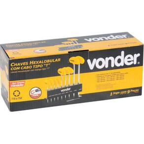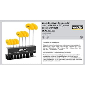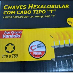 Conteúdo da Embalagem: 1 Jogo de chaves hexalobular com cabo, composto por um suporte metálico com 9 peças, sendo: T10 x 100 mm - T15 x 100 mm - T20 x 100 mm - T25 x 100 mm - T27 x 150 mm - T30 x 150 mm - T40 x 150 mm - T45 x 200 mm e T50 x 200 mm Marca: Não Informado