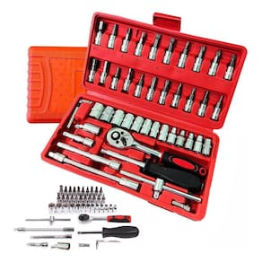 O kit contém 46 peças cuidadosamente selecionadas para oferecer a chave certa para qualquer trabalho. Inclui 21 peças de soquetes de bit, 13 peças de soquetes DR de 1/4, 3 peças de chaves hexagonais, 1 peça de junta universal de 1/4 DR, 1 peça de barra de extensão de 1/4 DR x 2, 1 peça de barra de extensão de 1/4 DR x 4, 1 peça de extensão flexível de 1/4 DR x 6, 1 peça de T-Bar deslizante de 1/4 DR, 1 peça de T-Bar deslizante de 1/4, 1 peça de alça de catraca rápida de 1/4, 1 peça de adaptador de bit e 1 estojo de armazenamento.
