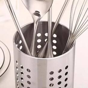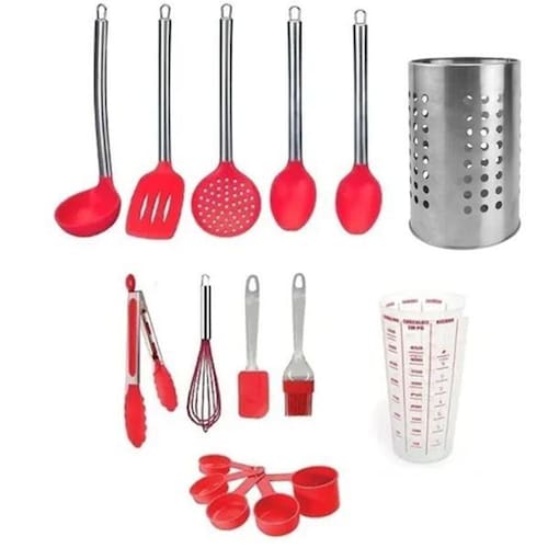 02 - Colheres de Silicone com cabo em Inox 01 - Escumadeira de Silicone com cabo em inox 01 - Espátula Vazada de Silicone com cabo em Inox 01 - Concha de Silicone com cabo em inox 01 - Pegador de Saladas de Silicone com cabo inox 01 - Batedor de Ovos em Silicone com cabo inox 01 - Pincel de Silicone com Cabo Acrílico 01 - Espátula de Silicone com cabo Acrílico 01 - Copo graduado 500ml 05 - Colheres medidoras em plástico Material: Plástico Cor: Vermelho Capacidade da copa: 1/8cup 30 ml , 1/4cup 60 ml , 1/3cup 80 ml , 1/2cup 125 ml , 1cup 250 ml Capacidade de colher: 1/4sp 1.25 ml , 1/2sp 2.5 ml , colher de chá 5 ml , 1/2 colher de sopa 7.5 ml , 1 colheres de sopa 15 ml 1 Porta talheres escorredor inox Dimensões do produto Comp x Larg x Altura : 9 cm x 9 cm x 12 cm