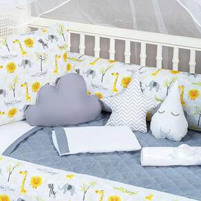 Kit jogo de berço safari 2 laterais 13 peças novo modelo KIT BERÇO 13 PEÇAS Contém: 1 Cabeceira 0,60cm X 0,40cm.2 Laterais 1,25m X 0,25cm.1 Lençol de cima 1,30cm X 0,70cm.1 Fronha 0,28cm x 0,38cm.1 Bando do mosquiteiro 1,40m x 0,20cm.1 Mosquiteiro 4,50m x 1,50m.1 Almofada nuvem 0,40cm x 0,20cm.1 Almofada Gota 0,30cm x 0,22cm1 Almofada estrela 0,30cm X 0,30cm.1 SAIA BOX 1,30m x 0,70cm x 0,30cm.1 Edredom 1,30m x 0,75cm1 Trocador 0,60cm x 0,42cm DESCRIÇÃO DAS PECAS :Tecido estampado: 100% AlgodãoTecido liso: 50% Algodão| 50% PoliésterEnchimento 100% PoliésterMosquiteiro 100% Poliamida Informações Importantes:O produto já vai pronto para o uso, com o enchimento já incluso.Acompanha as peças conforme a descrição, não esta incluso o BerçoA cabeceira e as laterais do kit possuem zíper para retirar o enchimento,Facilitando assim uma possível lavagem do produto.