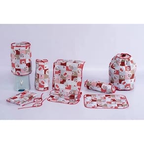 01 cortina com ilhós 2,00m largura x 1,45m altura 01 caminho de mesa 1,50m x 40cm 01 capa de liquidificador 01 capa de galão de água 20 litros 01 toalha de fogão 48cm x 48cm 01 capa para botijão 01 puxa saco 02 amarris para cortina