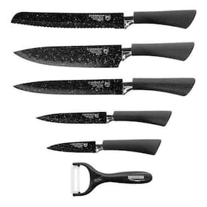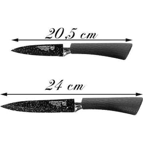 Facas afiadas de cozinha Everrich proporcionam rapidez e qualidades nas tarefas culinárias. kit com 7 peças, sendo 5 facas antiaderentes, 1 descascador de legumes em cerâmica e um suporte magnético.