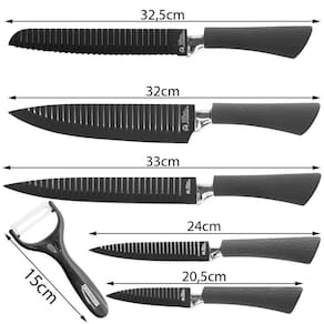 Facas afiadas de cozinha Everrich proporcionam rapidez e qualidades nas tarefas culinárias. kit com 6 peças, sendo 5 facas antiaderentes, 1 descascador de legumes em cerâmica.