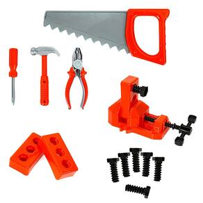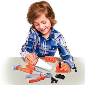 • Um super kit com morsa, ferramentas, parafusos e acessórios para as crianças brincar e aprender.