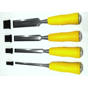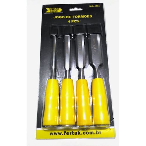 Jogo de Formões para trabalho profissional em madeiras, composto por 4 formões confeccionados em Aço Carbono, com cabo em Plástico Amarelo e proteção de aço na ponta do Cabo, para maior resistência.
