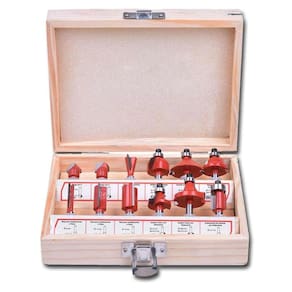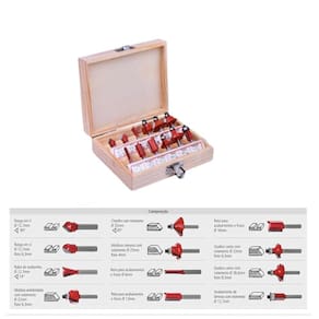 - 1 Rasgo em V 12,7mm 90c - 1 Rasgo em U 12,7mm Raio 6,3mm . - 1 Rabo de Andorinha 12,7mm 14c . - 1 Moldura Arredondada com Rolamento 22mm Raio 6,3mm . - 1 Chanfro com Rolamento 32mm 45c . - 1 Moldura Romana com Rolamento 25mm Raio 4mm . - 1 Reta para Acabamentos e Frisos 6mm - 1 Reta para Acabamentos e Frisos 12mm - 1 Reta para Acabamentos e Frisos 16mm - 1 Quebra Canto com Rolamento 22mm Raio 6,3mm - 1 Quebra canto com Rolamento 28,6mm Raio 9,5mm . - 1 Acabamento de Lâminas com Rolamento 12,7mm