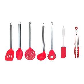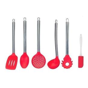 Jogo De Silicone Colher Concha Escumadeira 7 Peças Vermelho Com Cabo de Inox01 Escumadeira com cabo em inox01 Espátulas Pequena com cabo plástico Transparente01 Concha com cabo em inox01 Pegador de Macarrão com cabo em inox01 Colher Arroz com Cabo em Inox01 Espátula Grande com Cabo em inox01 pegador de salada/carnePeças de 15 à 34cm, feitas em silicone com resistência e durabilidade.