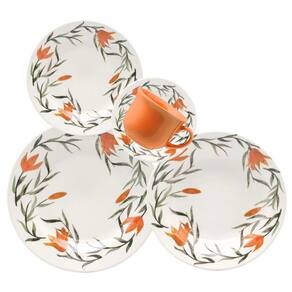 As bordas de cada borda e pires recebem o desenho feito à mão da flor de cor laranja junto de ramos e folhas. As cores são vibrantes e trazem alegria à mesa. A xícara é esmaltada em laranja.