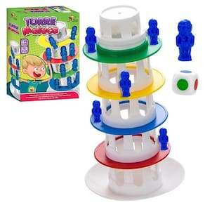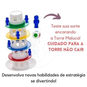 Role o dado e coloque os turistas no andar com a cor correspondente que sair no dado, mas cuidado para não fazer muito peso de um lado só ou a torre vai cair Jogo super divertido, para jogar com amigos e a familia, relembrando o jogo dos anos 80 torre de pisa.