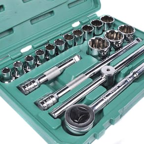 Kit Jogo Soquetes Sata 18 Peças 10-32mm 1/2Código: 3307556Kit Jogo Soquetes Sata 18 Peças 10-32mm 1/2O Jogo de soquetes ou também conhecido como Jogo de PITO tem como principal objetivo a facilidade na troca de medidas dos soquetes, agilizando assim o trabalho a ser feito- Melhor custo-benefício- Preço baixo- Qualidade superior- Fabricado em Aço Cromo VanadiumCaracterísticas:- Todos os itens abaixo já com encaixe de meia polegada (1/2);- Soquetes Estriados: 10, 11, 12, 13, 14, 15, 16, 17, 19, 21, 24, 27, 30, 32 mm;- Catraca Cabeça Redonda;- Extensão Angular 5 e 10;- Cabo T;- Maleta de transporte.Peso:- 4,0Kg Ean: 7891645081232