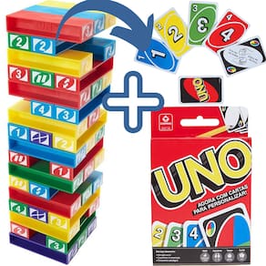 Diversão vertical! Este é o Uno Stacko! Baseado no famoso jogo de cartas Uno, este jogo possui 45 blocos com diversas cores e numeros que são empilhados. O Objetivo do jogo é puxar os blocos e reposicionar em cima da torre sem deixa-la cair. O próximo adversário precisa tirar um bloco com a mesma cor ou numero do bloco que você retirou. Os blocos de ação adicionam mais emoção ao jogo pulando a vez do próximo adversário, invertendo a ordem ou fazendo seu oponente ter que retirar dois blocos da pilha.