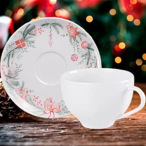 Dê um toque especial às suas noites com este encantador conjunto de xícaras e pires "Noite Feliz". Perfeito para aquele café quentinho ou chá relaxante, ele traz charme e elegância para qualquer mesa. Ideal para presentear ou decorar sua casa