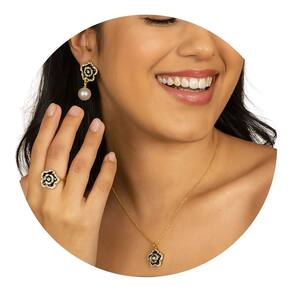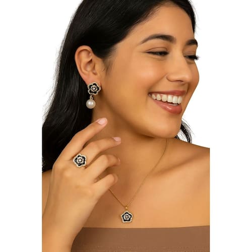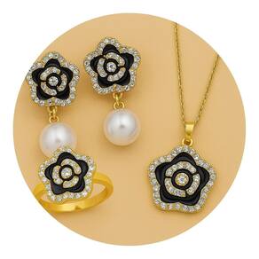 Este kit elegante é composto por três peças que combinam sofisticação e brilho: colar, brinco e anel com design floral. As flores em esmalte preto são contornadas por pequenas zircônias brilhantes, criando um visual refinado e delicado.