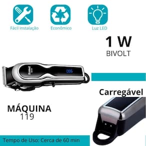 Kit Kemei Cabelo E Barba Recarregável Modelo: KM-119 Material da lâmina: cromo chapeado multa faca de aço cabeça Tamanho do produto: 180 X 45mm/7.09 X 1,77 Peso líquido: 0.72 kg Cor do produto: prata Voltagem : Bivolt 110V-220V Tensão do motor: 3.7 V Poder do corpo: 1W tpye: de impulso Velocidade do motor: 6800 RPM Método do uso: Recarregável/Ligar direto na tomada Indicadora: LED Capacidade da bateria: 2600mAh Use escopo: todas as pessoas Tempo de carregamento: cerca de 3 horas Tempo de uso: cerca de 60 min. Conteúdo do pacote: 1 X Aparador de cabelo 3 X Pentes 1 X Carregador 1 X Escova de limpeza Marca: Não Informado Ean: 7895714413337